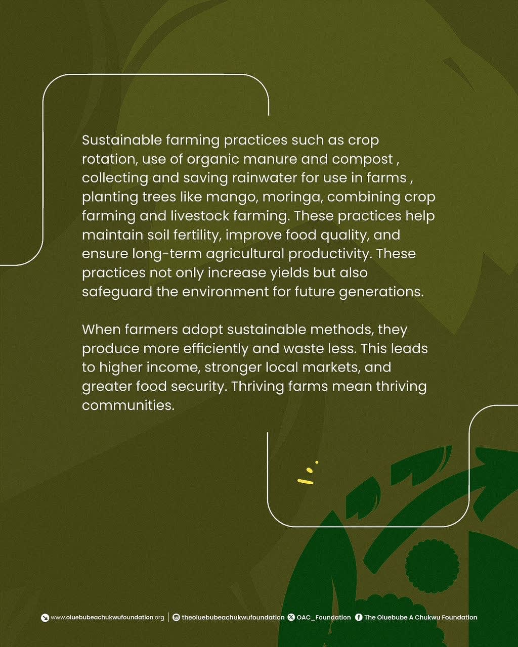 Sustainable farming practices such as crop rotation, use of organic manure and compost , collecting and saving rainwater for use in farms , planting trees like mango, moringa, combining crop farming and livestock farming. These practices help maintain soil fertility, improve food quality, and ensure long-term agricultural productivity. These practices not only increase yields but also safeguard the environment for future generations.