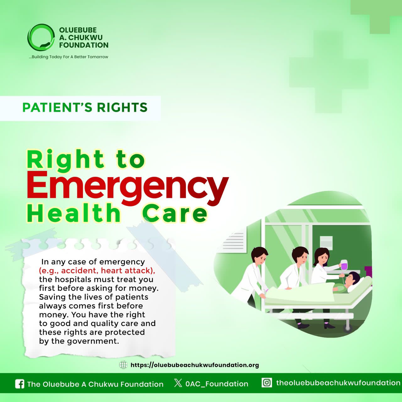 Hospitals must treat you in emergencies (like accidents or heart attacks) before asking for payment. Your life comes first, and the government protects your right to quality care.